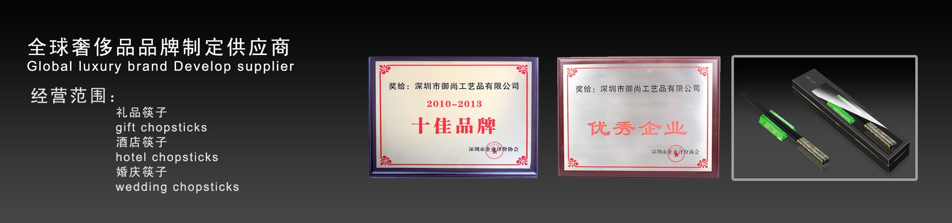 御尚健康產(chǎn)業(yè)(深圳)有限公司旗下御尚工藝筷子榮獲深圳市企業(yè)評價協(xié)會授予的2013年度“優(yōu)秀企業(yè)”和年度“十佳品牌獎”稱號。 深圳市御尚工藝品前身為深圳市御尚工藝筷子廠,是御尚健康產(chǎn)業(yè)(深圳)有限公司和香港御尚實業(yè)有限公司全資子公司,是一家專業(yè)從事高檔筷子及紅木工藝品設計,研發(fā)和銷售及生產(chǎn)為一體的專業(yè)供應商,位...【更多詳情】 |